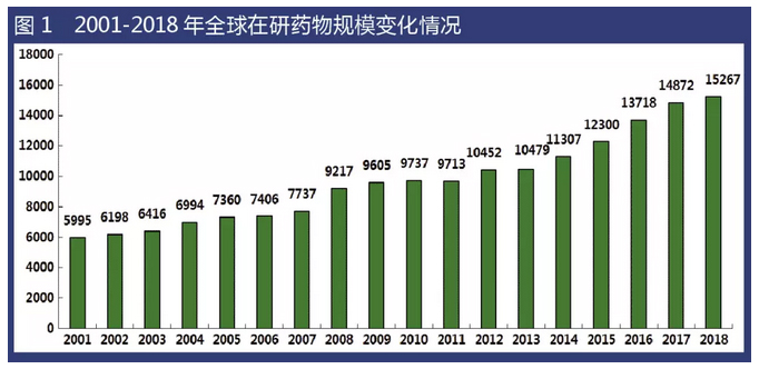 從2001-2018年數(shù)據(jù)看,全球在研新藥數(shù)量保持持續(xù)增長態(tài)勢,尤其是2011年以來,全球在研新藥數(shù)量呈現(xiàn)明顯增長勢頭。然而需要特別注意的是,雖然2014年以來全球在研新藥數(shù)量同比增幅均超過8.0%,但近兩年增速逐年放緩,2016年、2017年、2018年全球在研新藥數(shù)量增幅分別為11.5%、8.4%和2.7%。
