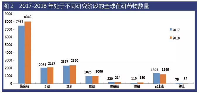 通過對比2018年和2017年處于不同研發(fā)階段的在研藥物規(guī)模后發(fā)現(xiàn),所有階段的在研藥物數(shù)量基本維持不變或僅有小幅變動(dòng)。