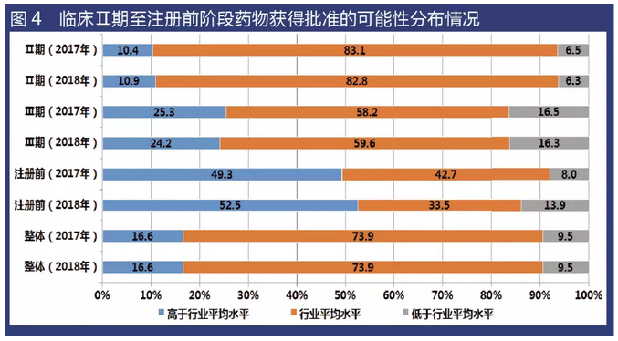 從統(tǒng)計(jì)數(shù)據(jù)來看,2018年“注冊前”藥物獲得批準(zhǔn)的可能性高于行業(yè)平均水平的藥物比例約為52.5%,較2017年(49.3%)有所升高;臨床Ⅲ期情況則相反,2018年獲得批準(zhǔn)的可能性高于行業(yè)平均水平的藥物比例為24.2%,較2017年(25.3%)有所下降。從臨床研究階段的整體數(shù)據(jù)看,2018年在研藥物獲批可能性的分布情況,與2017年數(shù)據(jù)基本一致。