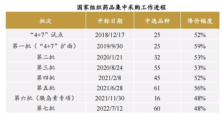從2018年國(guó)家醫(yī)保局成立為起點(diǎn),截至 2022 年第二季度末,我國(guó)國(guó)家組織藥品集中采購(gòu)已開(kāi)展近5年。5年間,涉及7 批國(guó)家組織藥品集中采購(gòu),覆蓋 294 種藥品,按集采前價(jià)格測(cè)算,涉及金額約占公立醫(yī)療機(jī)構(gòu)化學(xué)藥、生物藥年采購(gòu)額的 35%,一大批常見(jiàn)藥、慢病藥、抗癌藥價(jià)格大幅降低,平均降幅 53%。