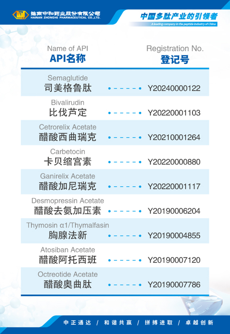 海南中和藥業(yè)股份有限公司(以下簡稱中和藥業(yè))成立于1995年4月17日,為我國最早專門從事化學(xué)合成多肽藥物的研究和實(shí)現(xiàn)產(chǎn)業(yè)化的國家高新技術(shù)企業(yè),中國國內(nèi)第一個(gè)化學(xué)合成多肽類新藥“注射用胸腺五肽”就由中和藥業(yè)自行研發(fā)上市,填補(bǔ)了中國多肽產(chǎn)業(yè)的空白。歷經(jīng)近30年的發(fā)展,公司產(chǎn)品已涵蓋免疫、腫瘤、肝病、心血管、內(nèi)分泌、婦科圍產(chǎn)等多個(gè)治療領(lǐng)域,并擁有多肽原料藥、化學(xué)原料藥及小容量注射劑(包括預(yù)灌封、卡式瓶)、凍干粉針劑、片劑、膠囊劑等多種劑型的生產(chǎn)能力,產(chǎn)品已成功出口韓國、烏茲別克斯坦等多個(gè)國家和地區(qū)。