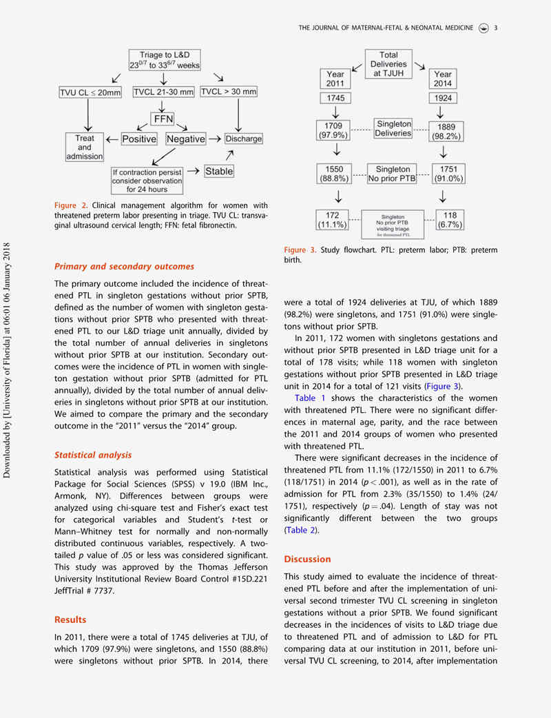 研究設(shè)計(jì):這是一項(xiàng)回顧性隊(duì)列研究,研究對(duì)象是2011年(1月1日至12月31日)和2014年(1月1日至12月31日)因先兆早產(chǎn)在Thomas Jefferson大學(xué)醫(yī)院(TJU)(賓夕法尼亞州費(fèi)城)就診的所有孕23 + 0/7至33 + 6/7周之間且既往無SPTB的單胎妊娠孕婦。自2012年1月1日開始起的兩年中開展TVU