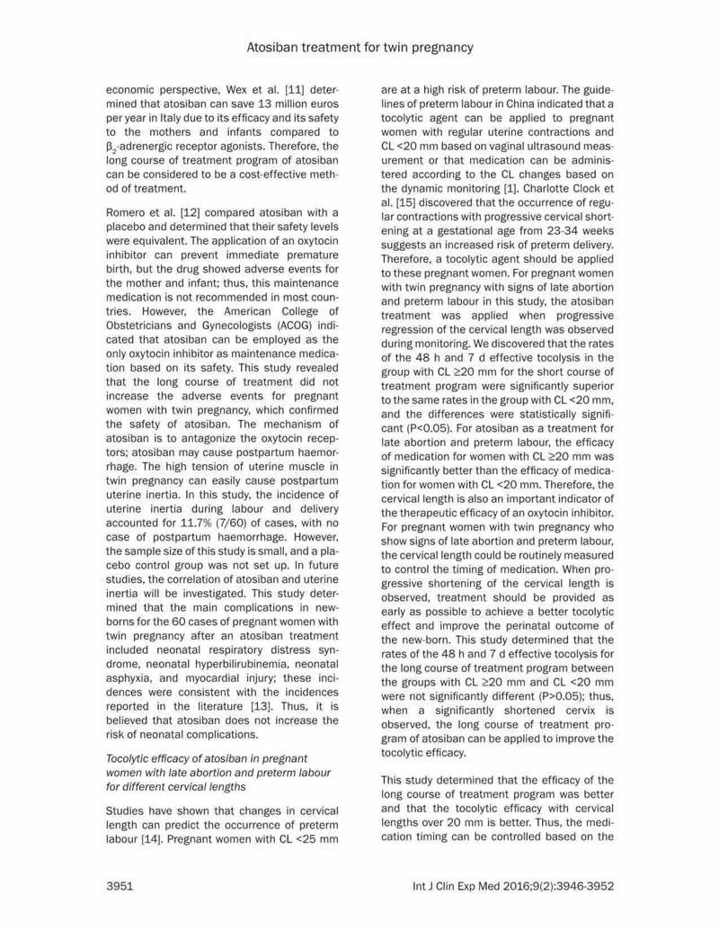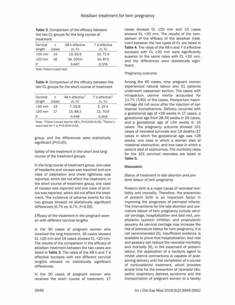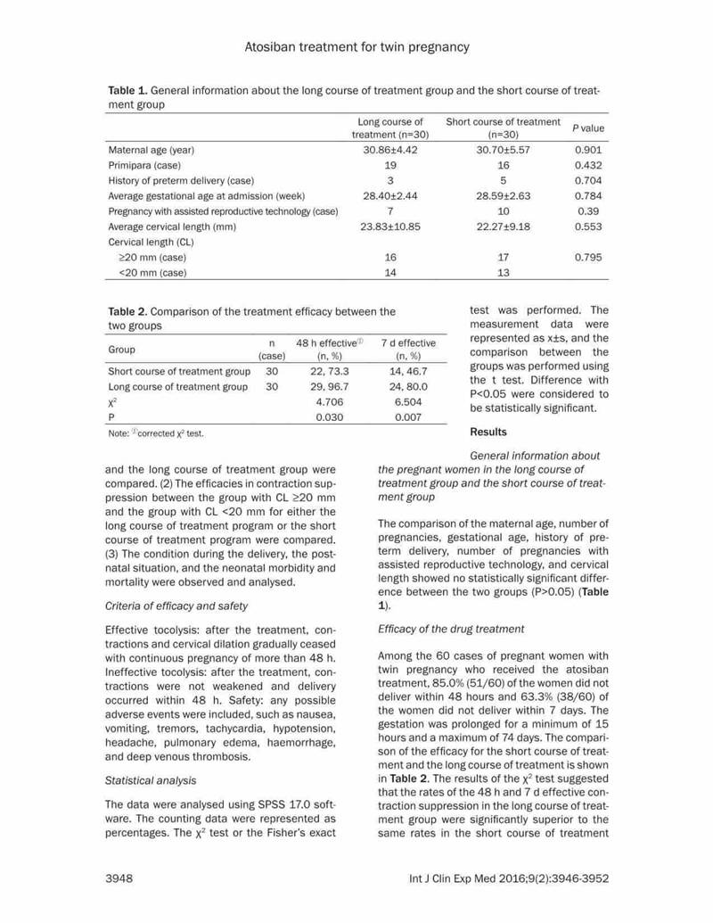 結論:阿托西班可有效延長晚期流產以及早產的雙胎妊娠的妊娠時間。對于宮頸長度<20mm的病例,長療程治療更有效,效果更好。長期治療不會增加母嬰的不良反應。