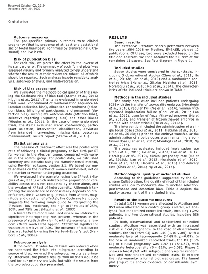 結論:阿托西班似乎可提高接受胚胎移植婦女的臨床妊娠率。