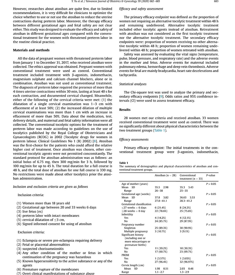 材料與方法:收集2017年1月1日至12月31日期間所有接受阿托西班治療的先兆早產(chǎn)孕婦資料,以常規(guī)治療(包括β-受體激動劑、吲哚美辛、硫酸鎂和鈣通道阻滯劑,單用或聯(lián)合應(yīng)用)的孕婦作為對照。